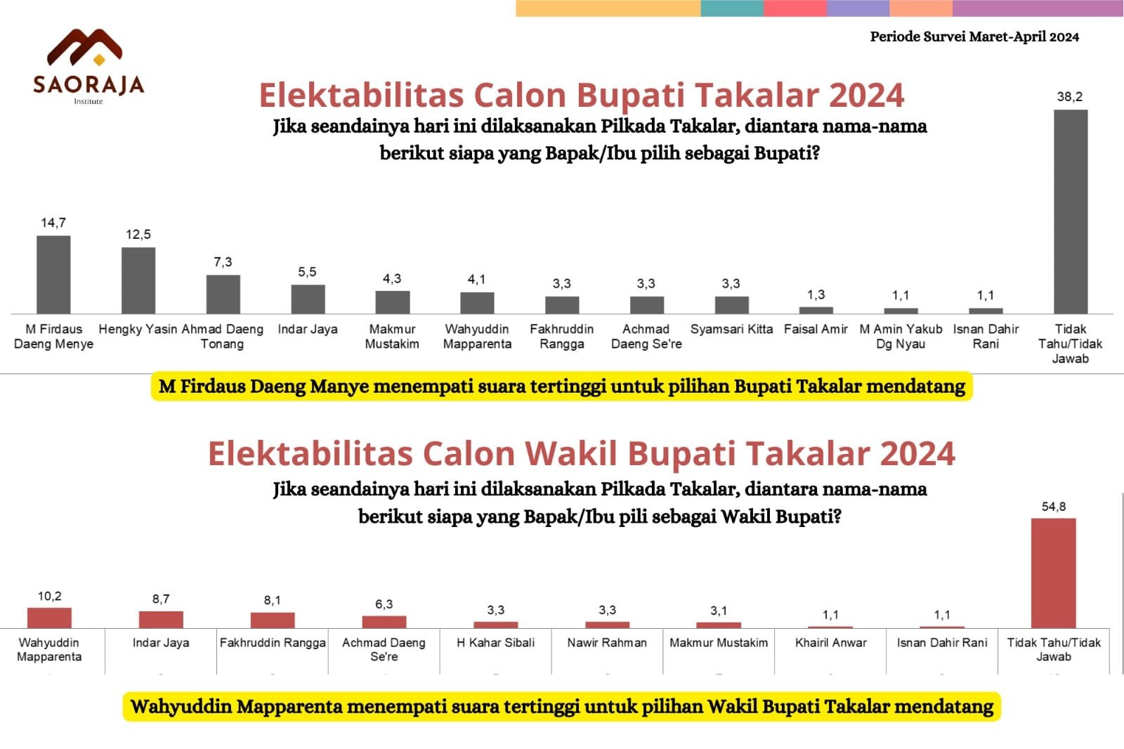 Dalam rilisnya, ditemukan beberapa nama figur atau tokoh Takalar yang berpeluang mendapat dukungan elektoral yang baik masyarakat. Untuk calon bupati, beberapa nama yang memiliki elektabilitas yang tinggi (3 besar), diantaranya, Mohammad Firdaus Daeng Manye sebanyak 14,7%, disusul oleh Hengky Yasin 12,5%, Ahmad Daeng Tonang 7,3%. Papan tengah ada nama Indar Jaya 5,5%, Makmur Mustakim 4,3%, Wahyuddin Mapparenta 4,1%, Fakhruddin Rangga, Achmad Daeng Se’re, dan Syamsari Kitta memiliki presentase yang sama sebesar 3,3%. Kemudian di papan bawah ada nama Faisal Amir 1,3%, M Amin Yakub Dg Nyau dan Isnan Dahir Rani masing-masing 1,1%. Responden yang tidak tahu/tidak menjawab sebesar 38,2%.