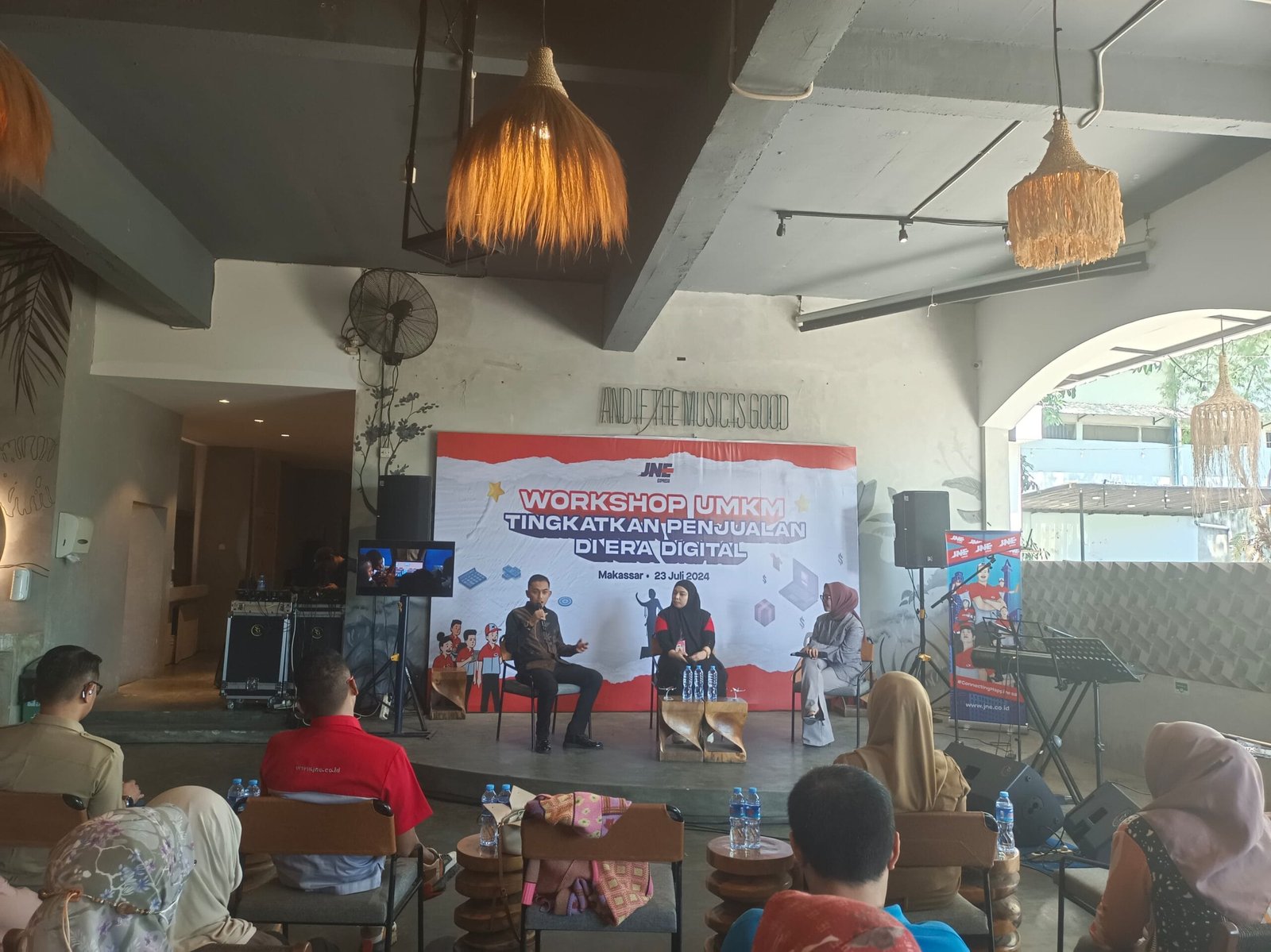 PT Tiki Jalur Nugraha Ekakurir (JNE) menggelar talkshow Usaha Mikro, Kecil, dan Menengah (UMKM) Go Digital di Warunk Roppan, Jalan Perintis Kemerdekaan, Makassar, Selasa (23/7/2024) siang.