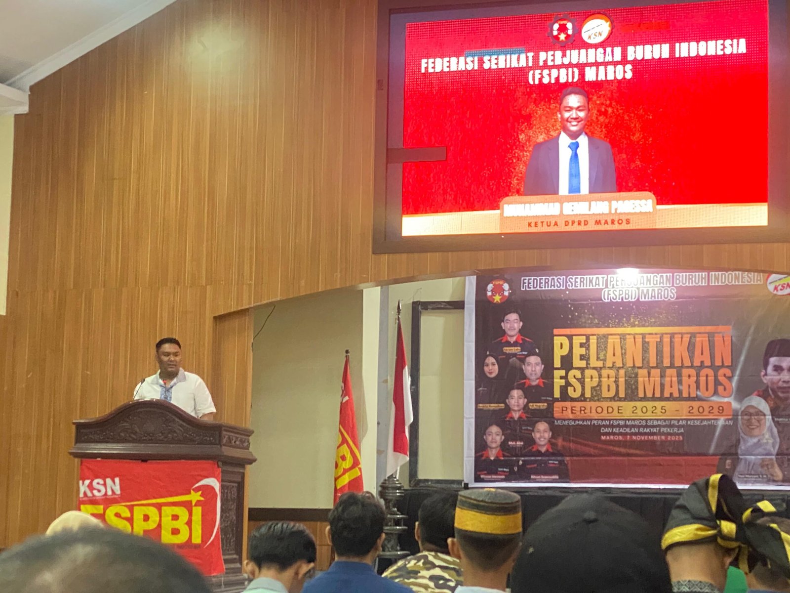 MAROS, FOLDERINDONESIA.COM — Ketua Dewan Perwakilan Rakyat Daerah (DPRD) Kabupaten Maros, Muhammad Gemilang Pagessa, menghadiri acara pelantikan pengurus Federasi Serikat Perjuangan Buruh Indonesia (FSPBI) Kabupaten Maros periode 2025–2029, yang digelar di Baruga Kantor Bupati Maros pada Jumat (7/11). Acara tersebut dihadiri oleh sejumlah perwakilan serikat pekerja, pengusaha, serta pejabat pemerintah daerah.